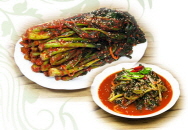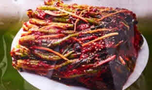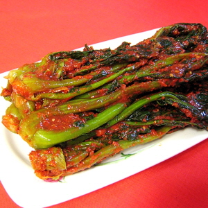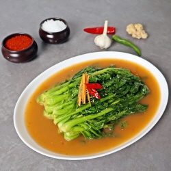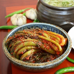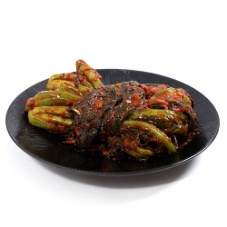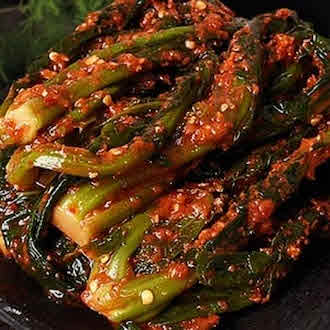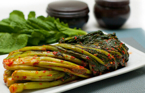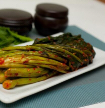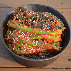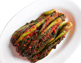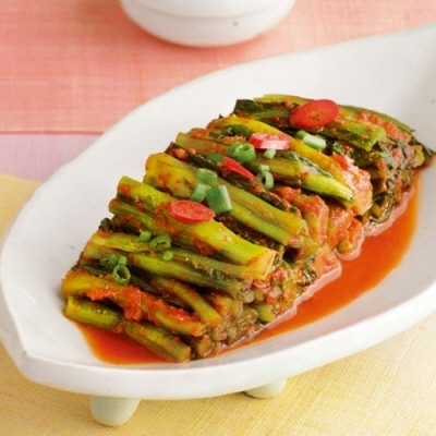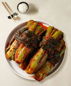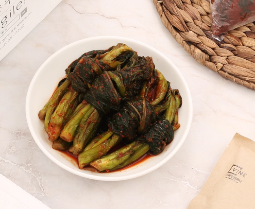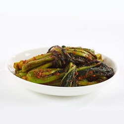 참나물과 함께 갓을 이용하여 만든 김치입니다. 참나물의 살코기와 갓의 담백한 맛이 어우러져 상큼하면서도 짭조름한 맛이 일품입니다.
