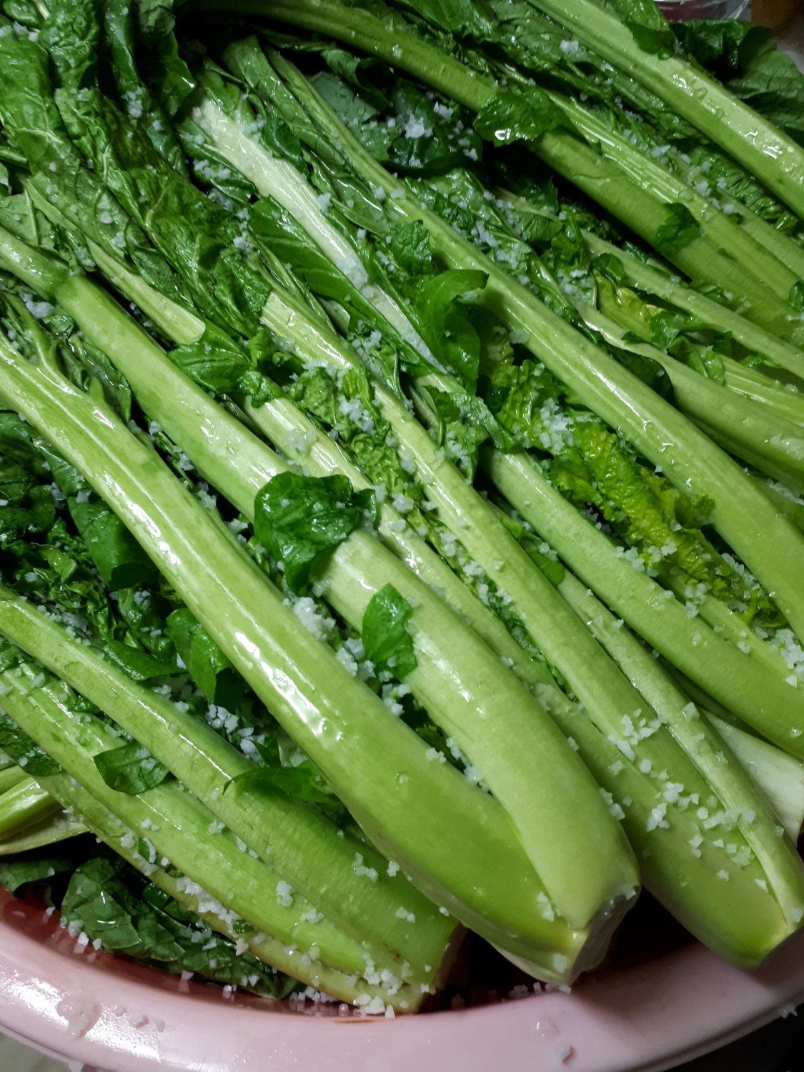 - 적당한 크기로 자른 갓에 멸치액젓(혹은 소금)을 넣고, 섞어준 뒤 30분 정도 재워둡니다.