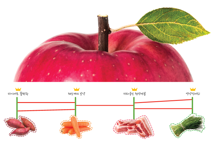 와 폴리페놀이 함유되어 있어, 암 예방에도 효과적입니다. 사과는 또한 심장 건강을 지키고, 혈당 조절에도 도움을 줍니다. 끊임없는 스트레스와 삶의 불균형으로부터 우리 몸을 보호하기 위해서는 사과를 꾸준히 섭취하는 것이 좋습니다.