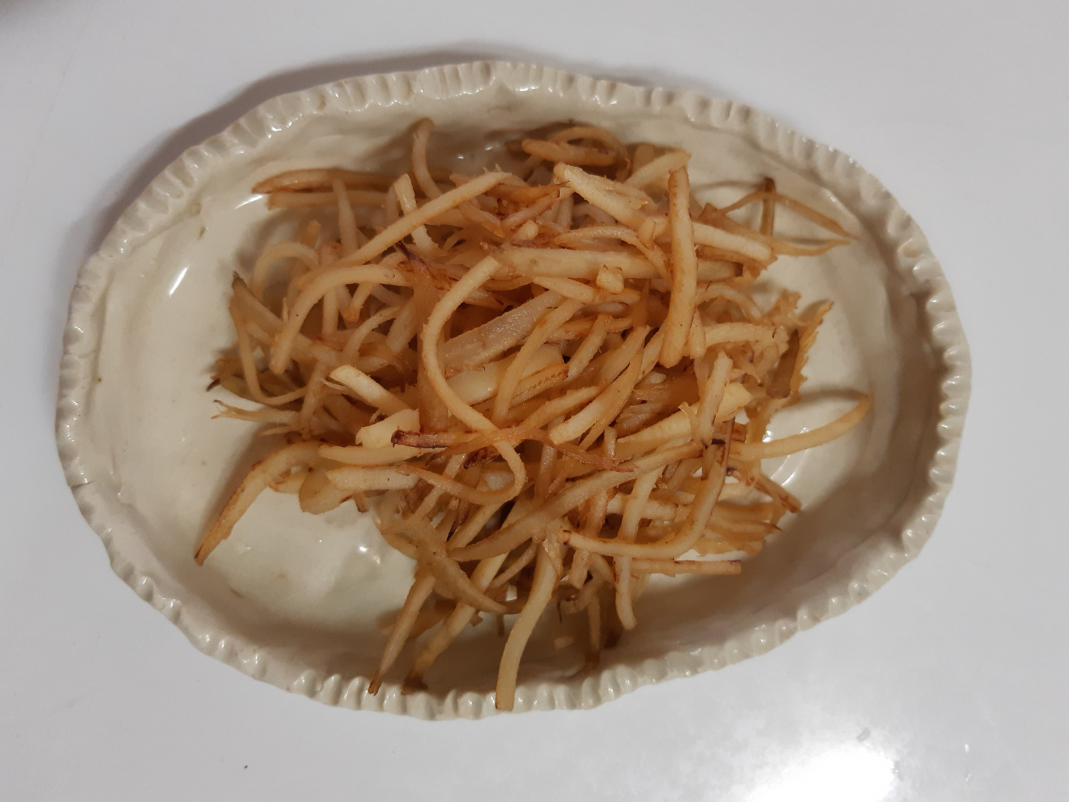 - 팬에 식용유를 두르고, 반죽에 묻힌 우엉 채를 넣어 중불에서 노릇하게 부쳐줍니다.