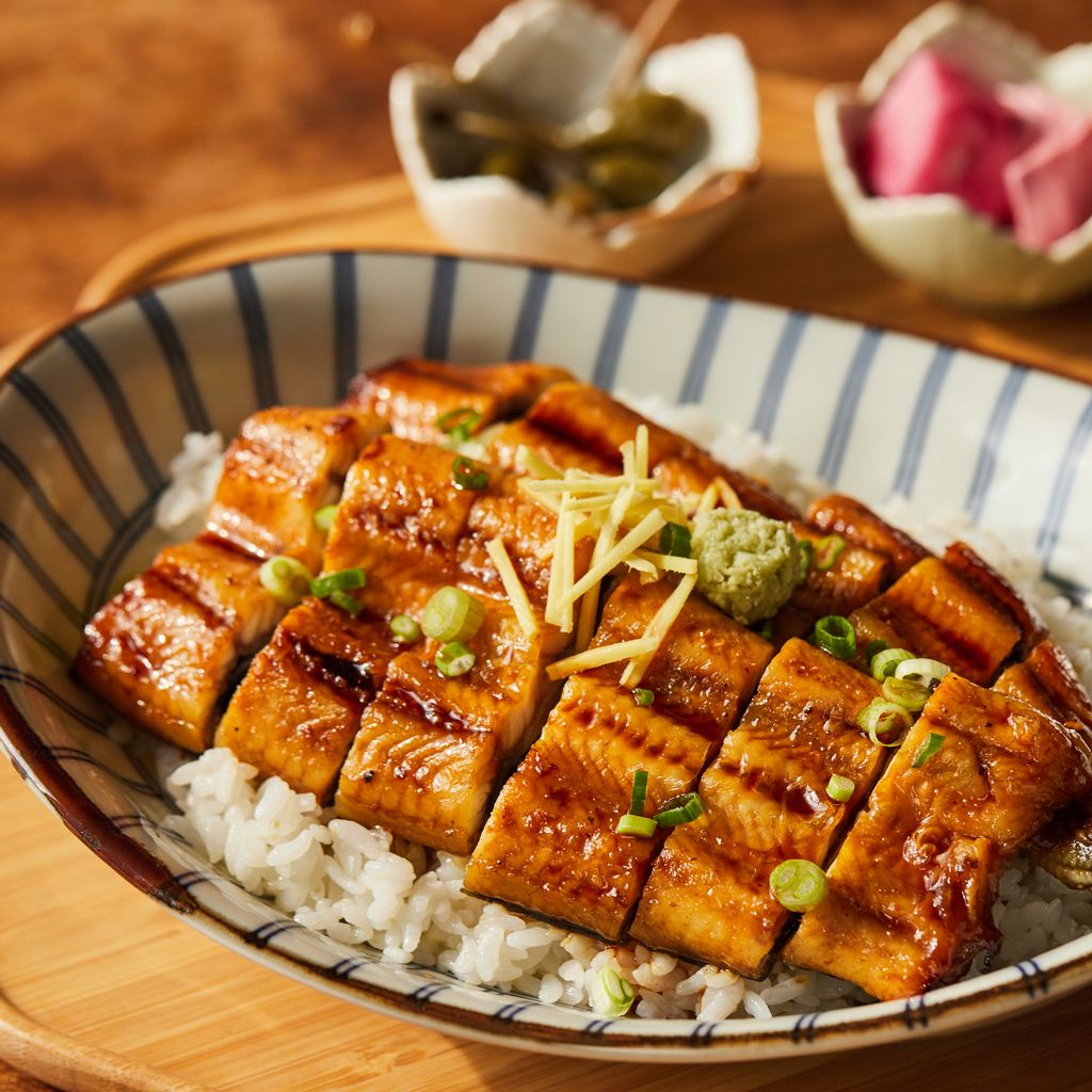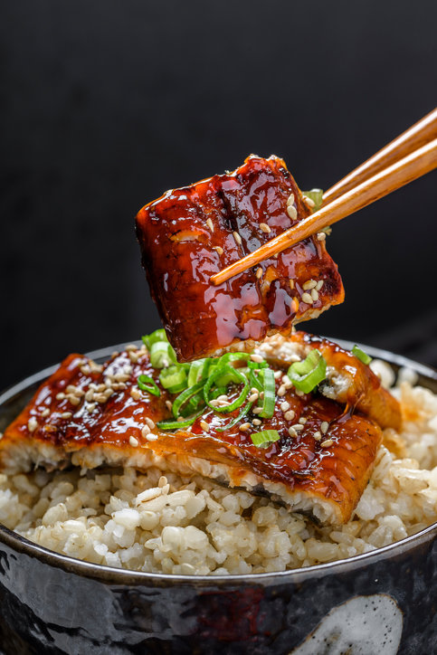 - 장어덮밥 그릇에 밥을 넣고, 위에 장어와 양파, 당근을 올려주세요.