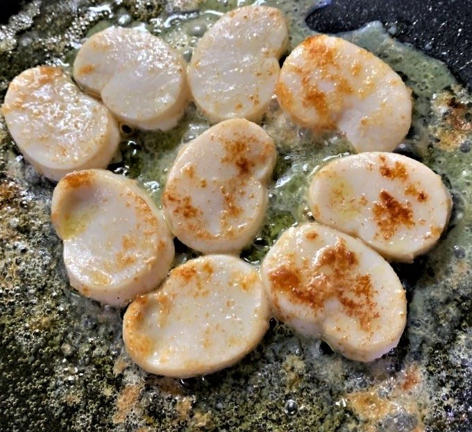 - 팬에 올리브 오일을 두르고, 키조개 관자를 넣어 중불로 구워주세요.