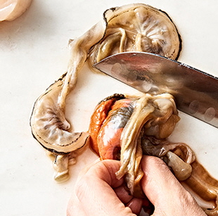 2. 껍데기 제거하기 키조개 껍데기는 손으로 쉽게 깨끗하게 제거할 수 있습니다. 껍데기를 제거할 때는 끝 부분을 잡고 한쪽으로 빠르게 잡아당겨 껍데기를 열면 됩니다. 껍데기가 잘 열리지 않을 경우는 물에 담갔는지 확인하고, 재빨리 잡아당겨야 합니다.